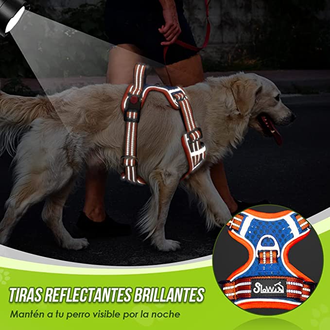 PECHERA DE MALLA TRANSPIRABLE: El arnés para perros de SlowTon está hecho de una malla de aire duradera que optimiza la ventilación de la piel y la comodidad de las mascotas. El borde suave ultra acolchado protege a los perros de la fricción de la piel incluso durante todo el día y en todo clima.