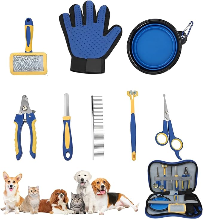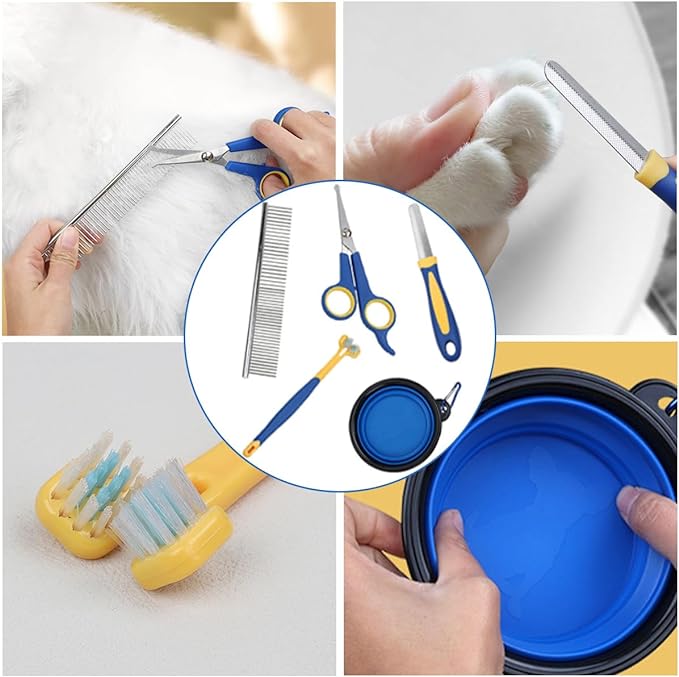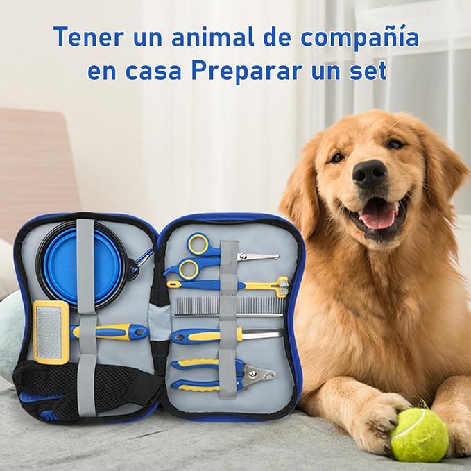 El juego incluye un cepillo de alfileres,cepillo de dientes,guantes de masaje,cuenco plegable para perros,cepillo de aseo,un cortaúñas, Lima,tijera y un Estuche,no es necesario repetir la compra de otros peines para mascotas.