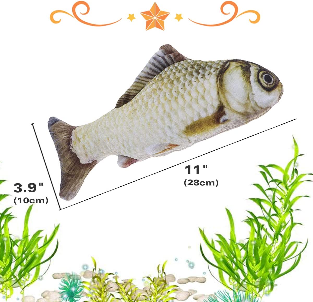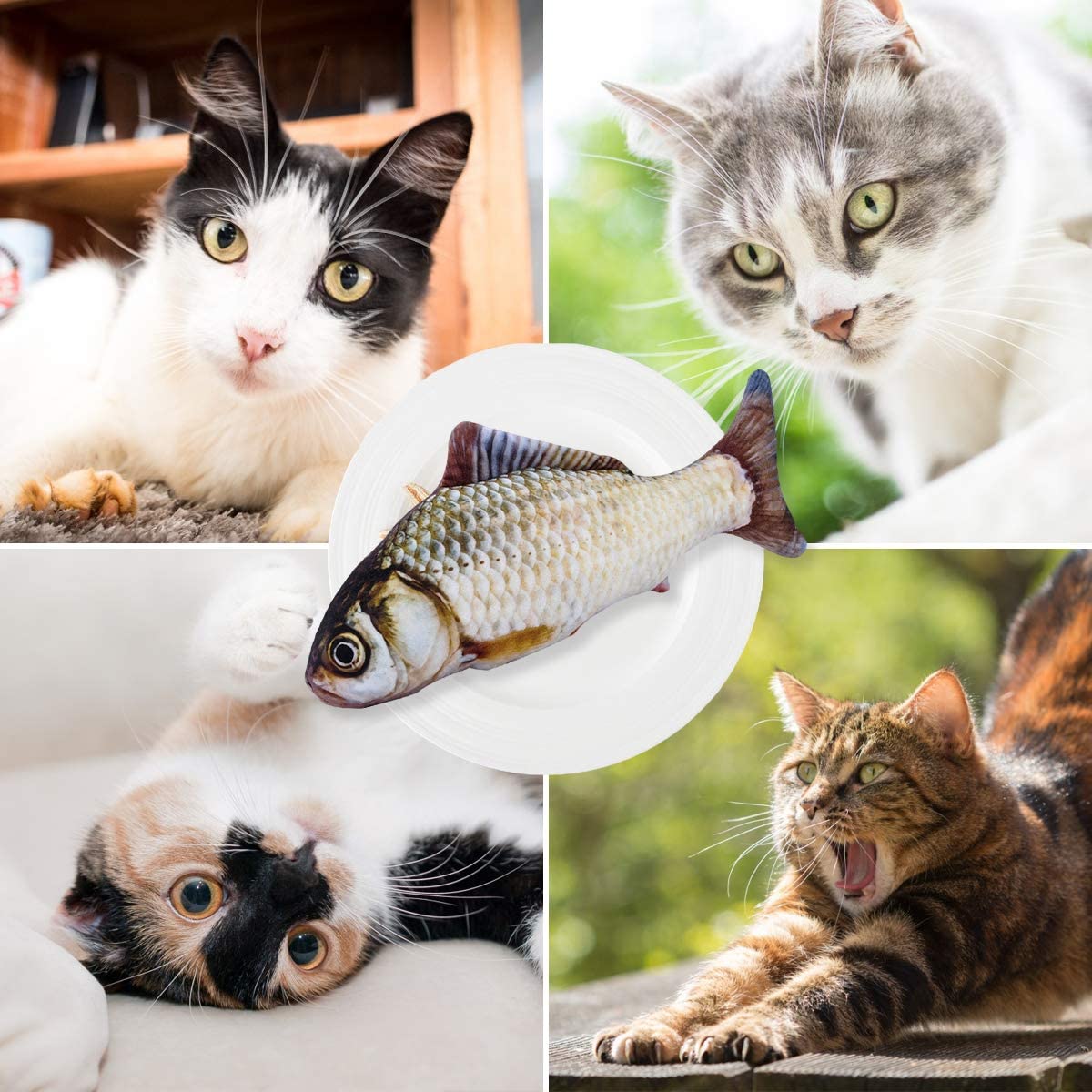 • Debido a un sensor táctil integrado, tu gato solo necesita golpear o tocar el cuerpo del pez, se voltea y se mueve automáticamente para atrapar los ojos del gatos, se entretienen mucho. También tiene un interruptor en la caja mecánica para inactivar el movimiento y que solo juegue con el muñeco inmóvil.