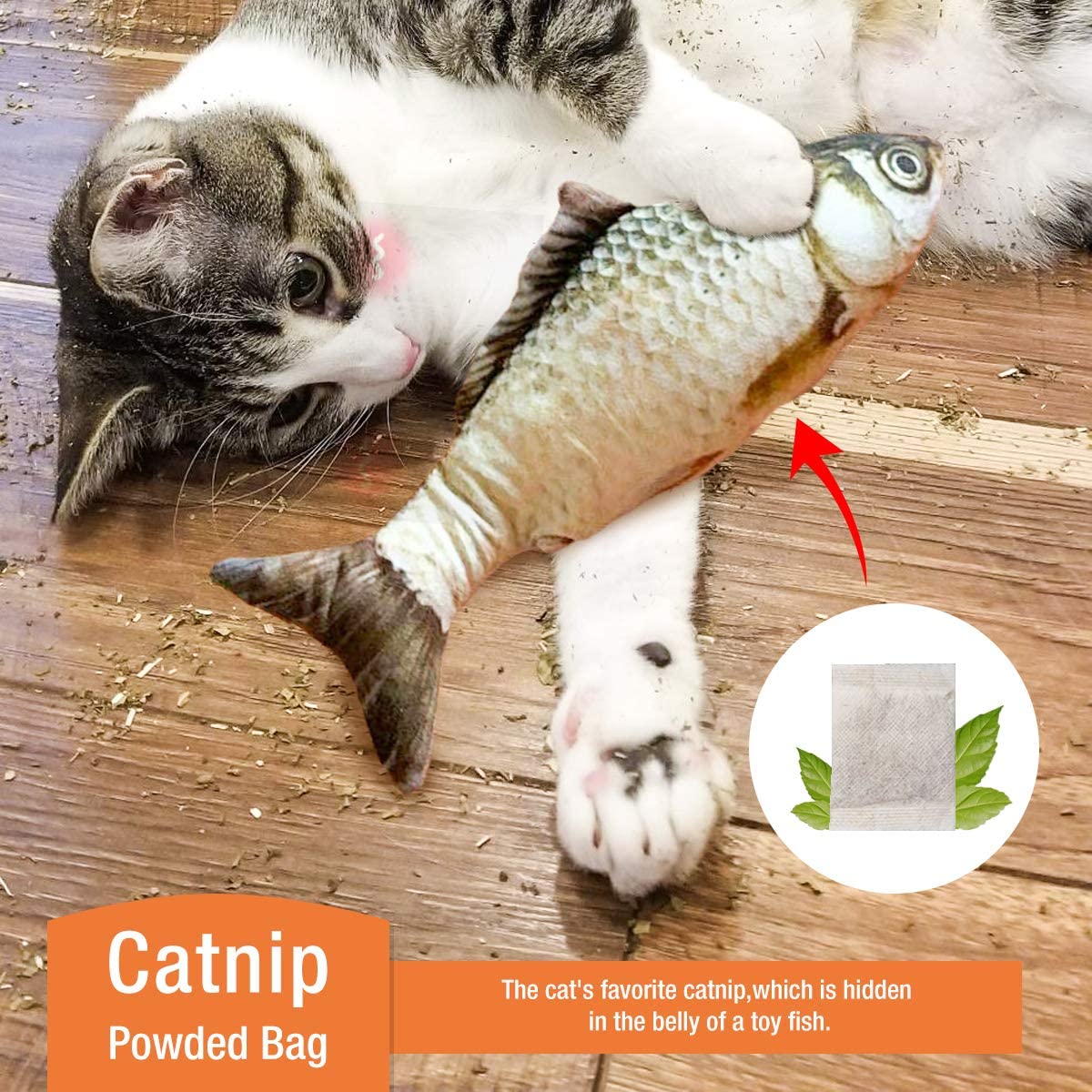 • Natural catnip adjunta en el paquete, añadirlo al abdomen de los peces, la fragancia de hierba gatera la cual estimula el juego y la curiosidad, incrementando la actividad y el ejercicio del gato.