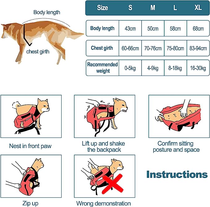 • Tamaño: S: busto 60-66cm, largo de espalda 43cm, circunferencia del cuello 30-40cm, apto para mascotas de 0-5 kg. M: busto 70-76cm, largo de espalda 50cm, circunferencia del cuello 35-45cm, apto para mascotas de 4-9 kg. L: busto 75-80cm, largo de la espalda 58cm, circunferencia del cuello 40-50cm, apto para mascotas de 8-18 kg. XL: busto 83-94cm, largo de espalda 68cm, circunferencia del cuello 48-63cm, apto para mascotas de 16-30 kg.