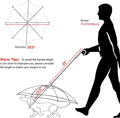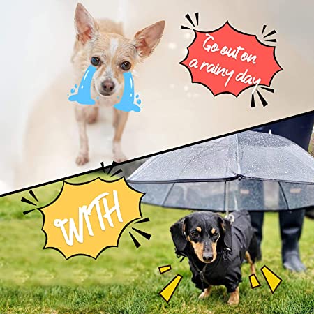 El paraguas de mascotas es impermeable y resistente al viento, diseñado para perros de razas pequeñas. Está hecho con un marco de metal sólido, poliéster duradero y transparente. Puede mantener a sus pequeños amigos a la vista mientras camina, lo que le ayudará a entrenar a sus perros para que se acostumbren a este paraguas para perros.