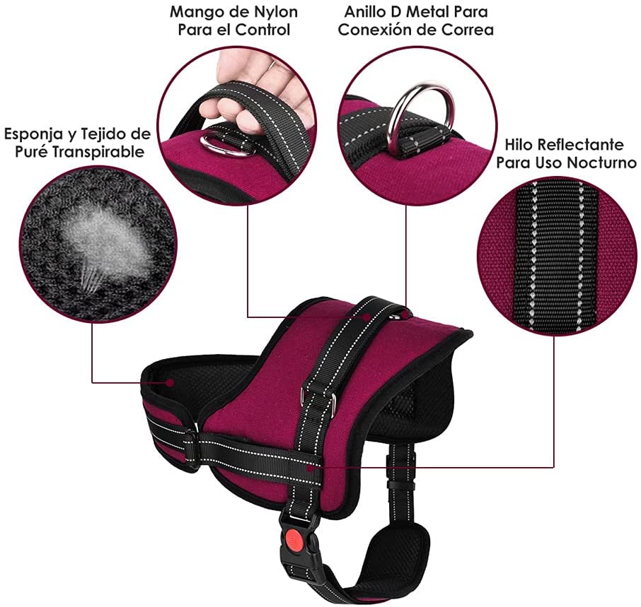 - Seguro y Cómodo — El pechera para perro proporciona un gran control general sobre el perro durante las caminatas, el diseño interior de la almohadilla es para una mejor comodidad y ventilación, por lo tanto, el aire puede entrar y salir fácilmente. El frente de la correa del cofre estaba cubierto con una capa de tela suave y transpirable para evitar que el cuello del perro se enrede y tirase. La presión de arrastre se distribuye uniformemente al cuerpo para evitar tirones y ahogamientos.