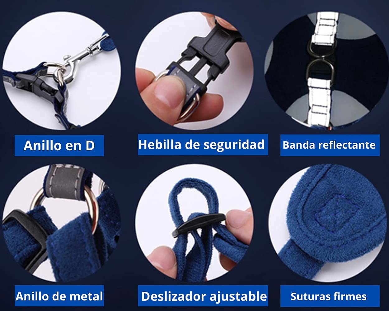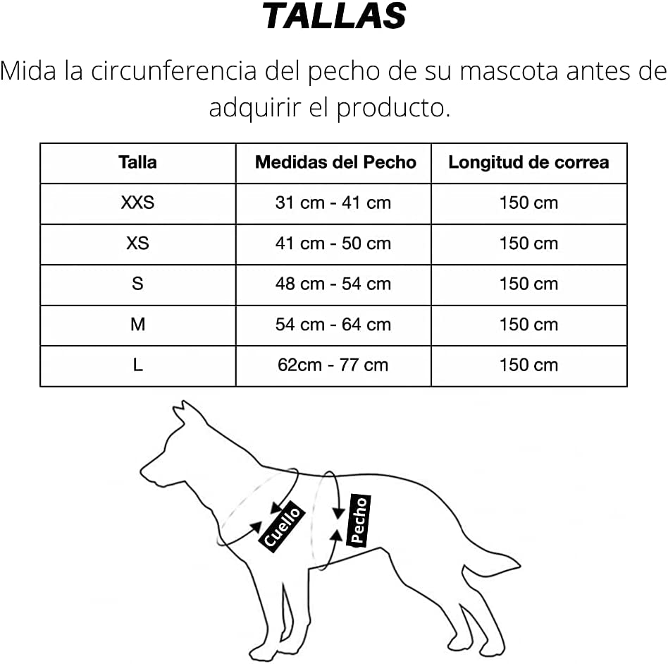 - ✔ AJUSTABLE Y FACIL DE PONER O QUITAR: Arnés con anillos de metal para garantizar su resistencia. Cuenta con 4 bandas ajustables para mejorar el agarre y la seguridad de su mascota. Su densidad es más baja que la fibra de poliéster convencional, favoreciendo una menor absorción de humedad, mejorando la permeabilidad al aire, el tacto suave, la elasticidad y una sensación elegante. Incluye una correa de 150 cm. Por favor, Consulte la tabla de tallas antes de adquirir el producto.