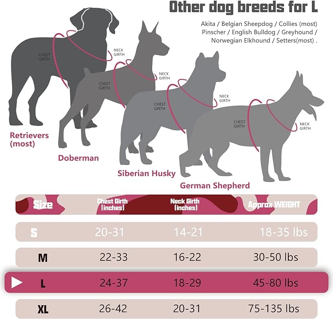 • Tamaño del arnés del perro: Se ajusta a la circunferencia del pecho de 20 – 31 in, 50.8 – 78.8 cm (S Talla) / 22 – 33 in, 55.8 – 83.8 cm (MTalla) / 24 – 37 in, 60.9 – 94 cm (L Talla) / 26 – 42 in, 66 – 106.6 cm (XL Talla)