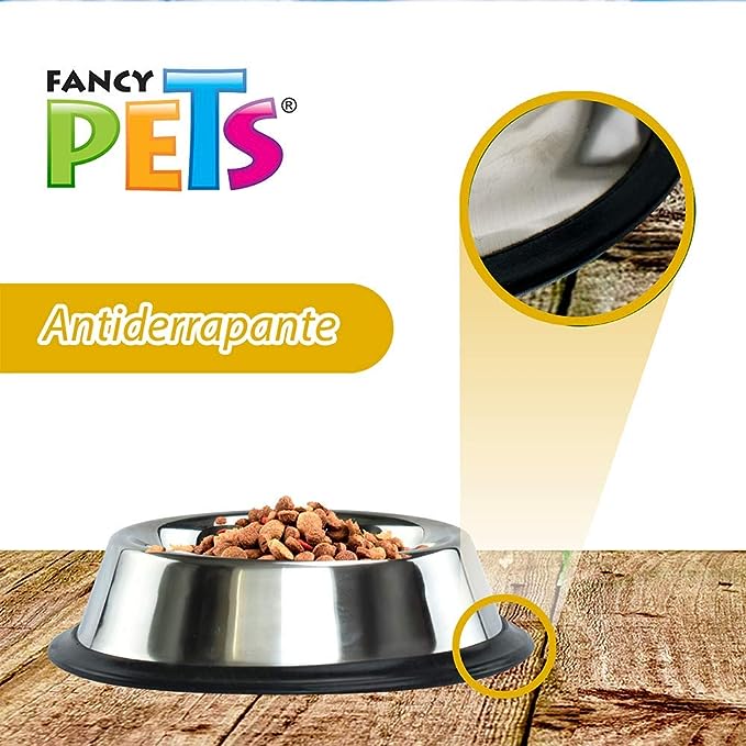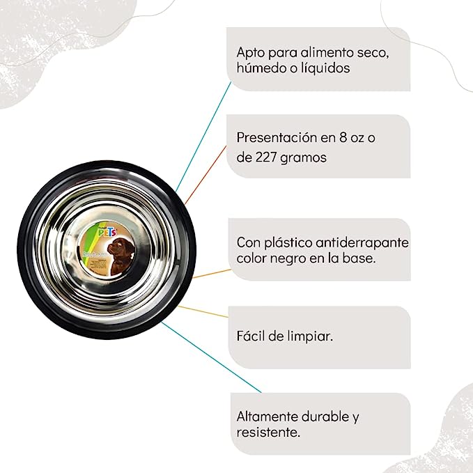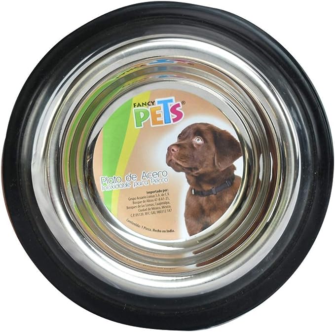 Plato para perro de acero inoxidable. Ideal para alimentar a la mascota. El plato es durable, resistente y fácil de limpiar. Además, cuenta con base antiderrapante color negro para evitar que se deslice y el perro pueda alimentarse o beber cómodamente. El diseño permite la perfecta distribución de los alimentos o líquidos dentro del plato.