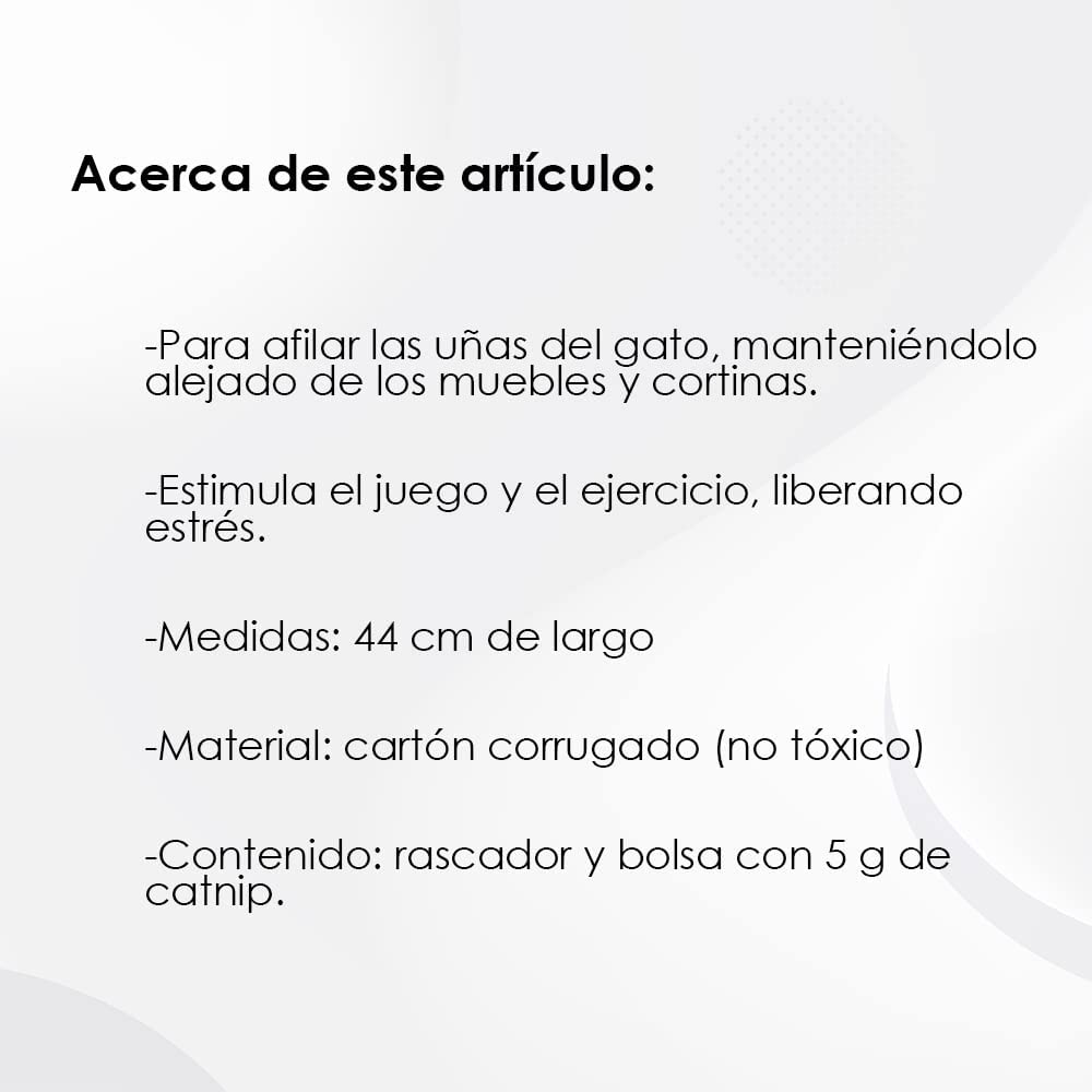 • Para afilar las uñas del gato, manteniéndolo alejado de los muebles y cortinas. Estimula el juego y el ejercicio, liberando estrés. Medidas: 44 cm de largo Material: cartón corrugado (no tóxico) Contenido: rascador y bolsa con 5 g de catnip.